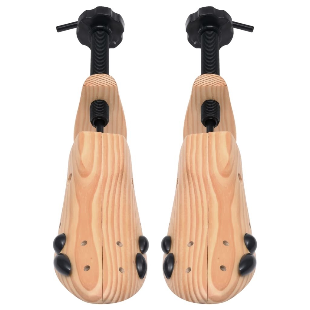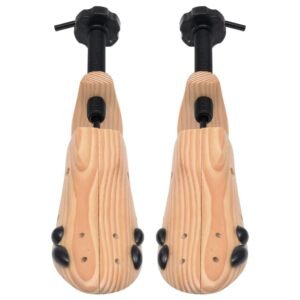 Keep your shoes in perfect shape for years to come with this pair of wooden shoe trees. You can adjust the length and width of the shoe trees by turning the knob and the L-shaped hook. Additionally, the holes in the shoe trees accommodate the included shoe blocks, which eliminate pressure points inside the shoes.