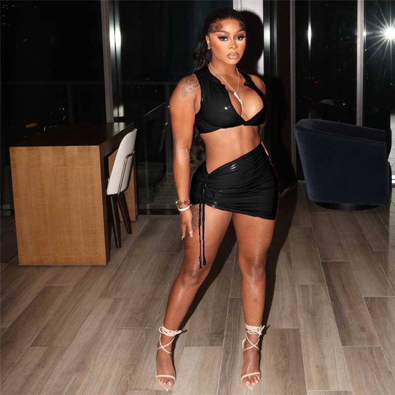 Women’s Fashion Glossy Undershirt Hip Short Skirt Set